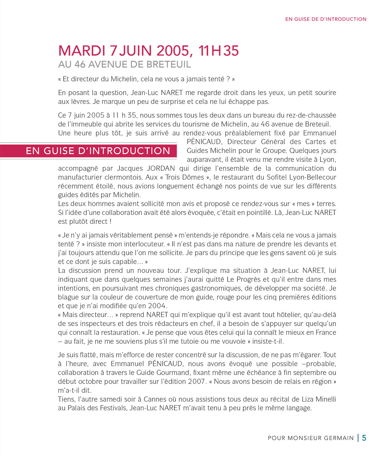 Au fil des pages, le lecteur va découvrir la vie de Gilbert Cousin alias « Monsieur Germain », participer à ses « expéditions gourmandes », partager des repas, se familiariser avec un univers souvent méconnu.